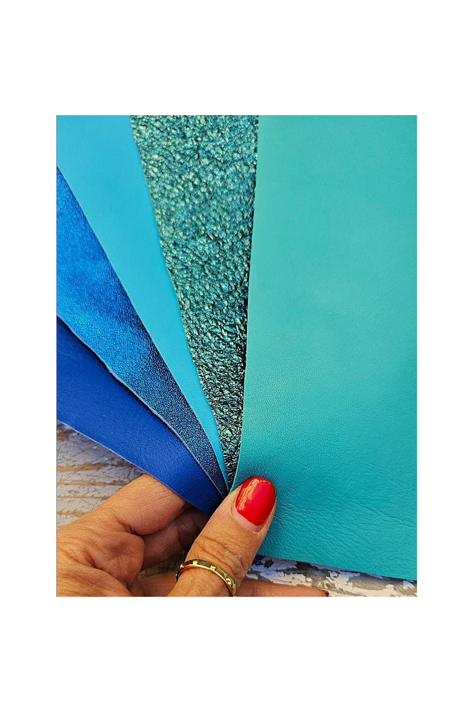 5 Ritagli di pellami unici selezionati, toni VERDE e BLU, laminati e non, pezzi mix di colori come da foto 25x20 cm