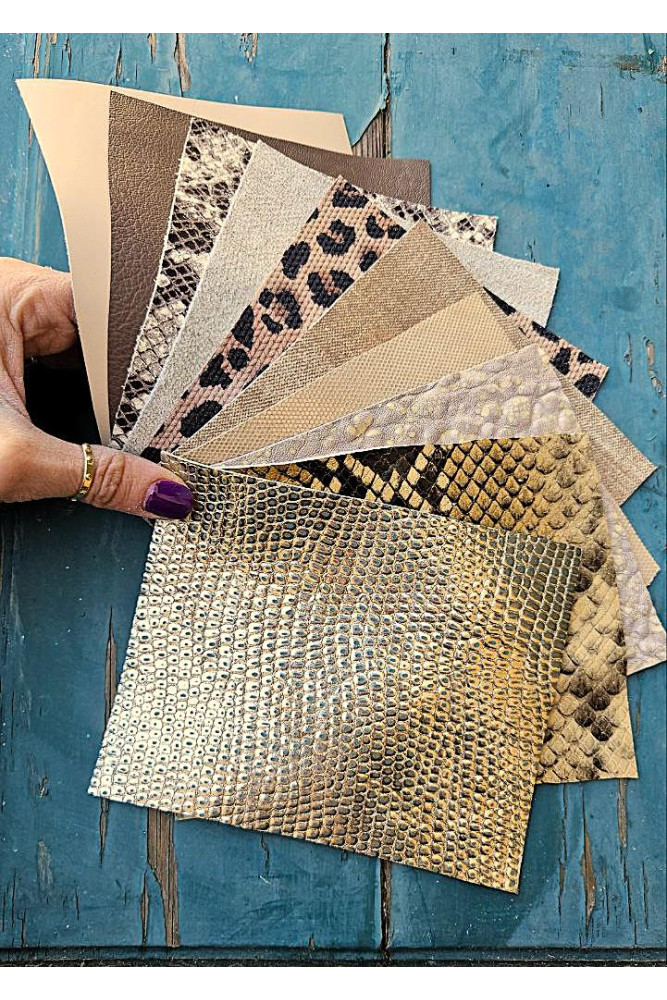 10 pezzi di piccole dimensioni di pelle miste fantasia, con stampe, lamine e morbidezze differenti, look sportivo/raffinato. Ritagli di vera pelle italiana. Dimensioni minime di 15 x 12 cm.