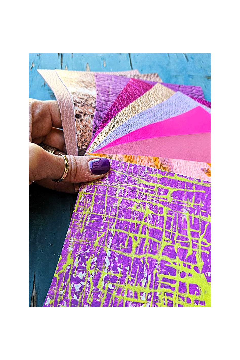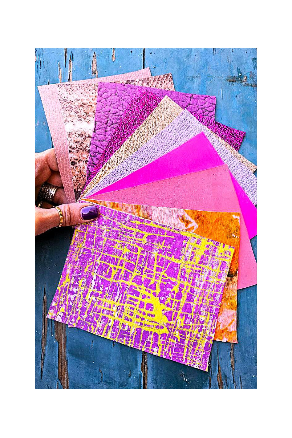10 Ritagli di pellami unici selezionati, ROSA e FUXIA, stampe varie, laminate e non, pezzi mix di fantasie come da foto