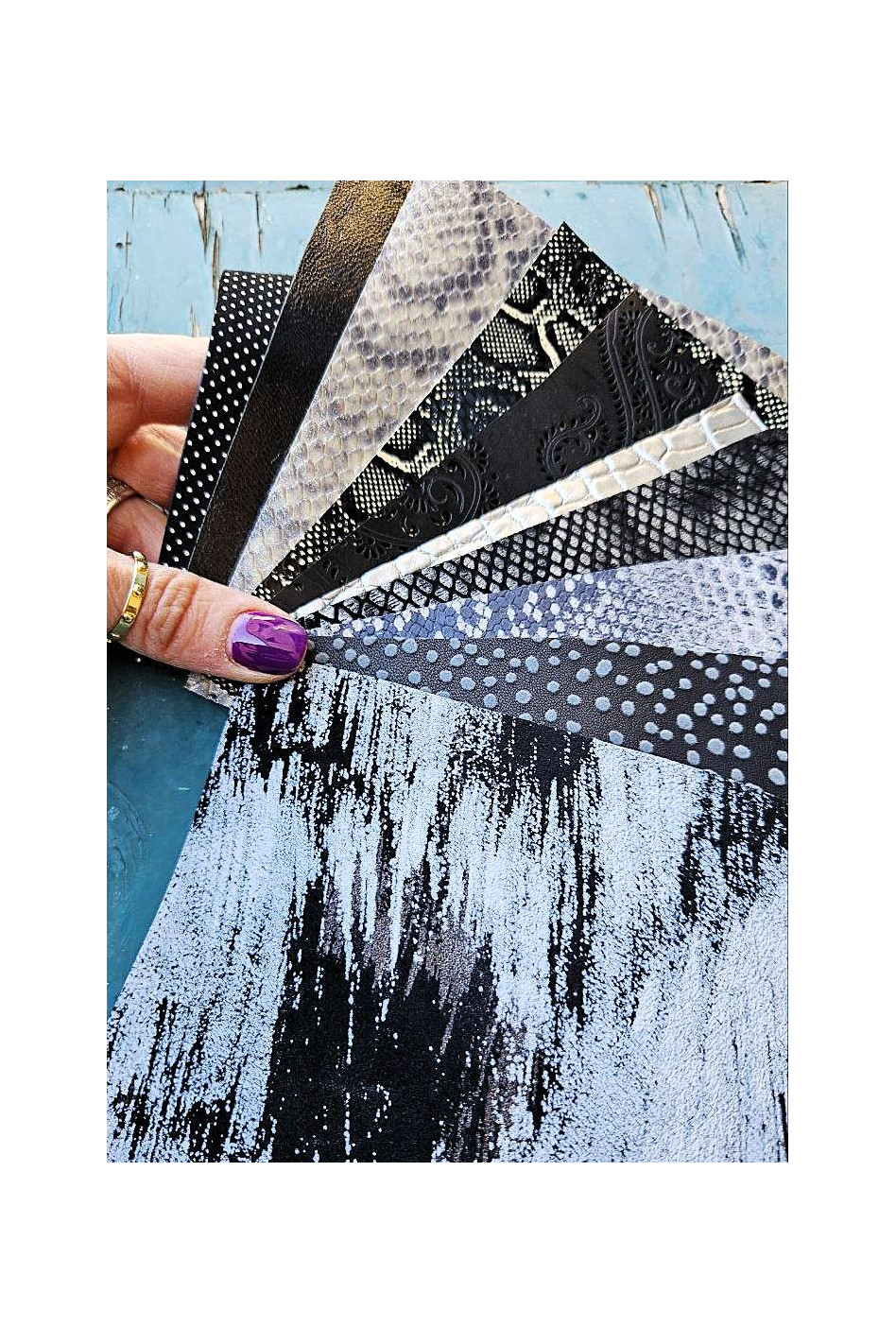 10 Ritagli di pellami unici selezionati, NERO e GRIGIO ,stampe varie, laminate e non, pezzi mix di fantasie come da foto
