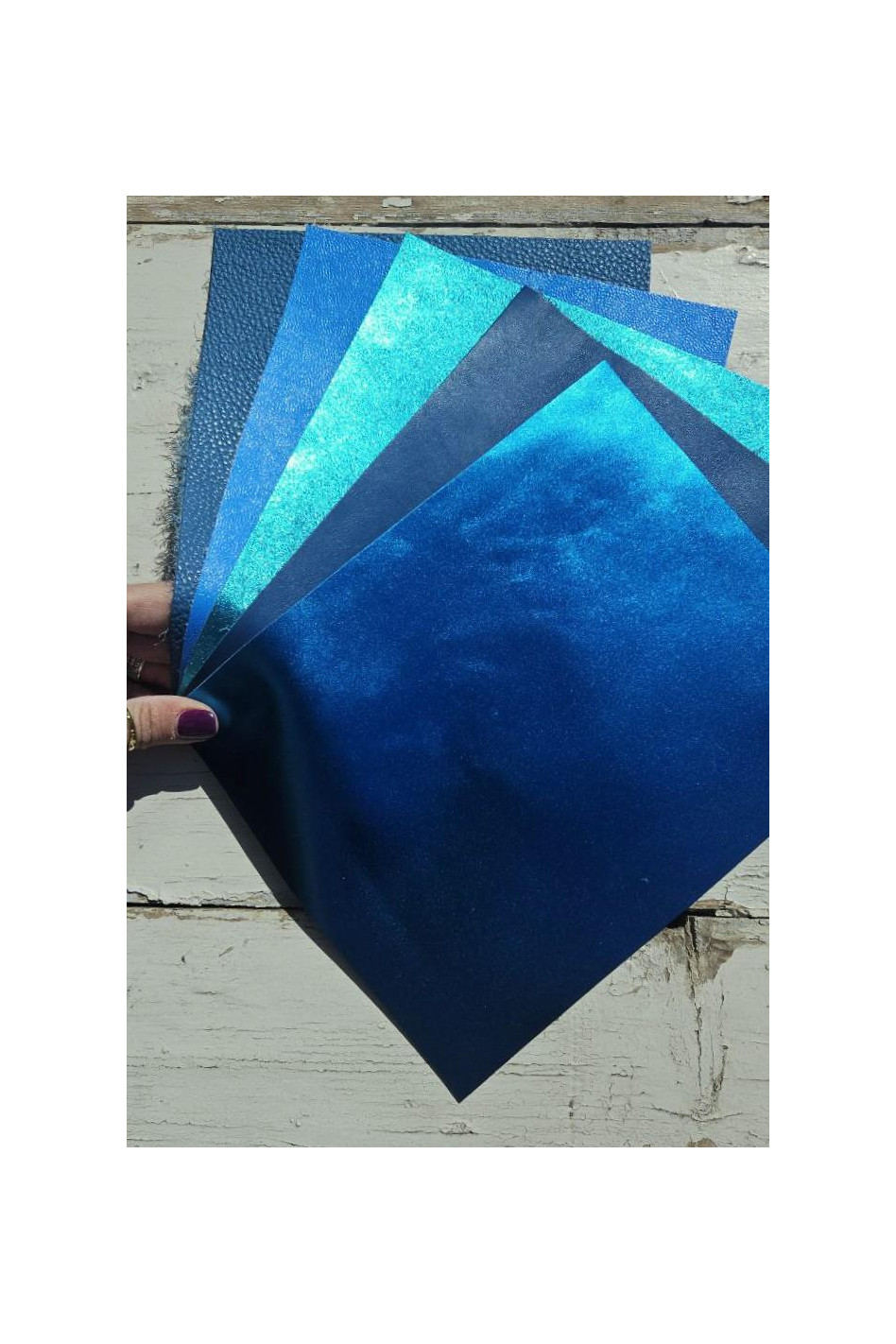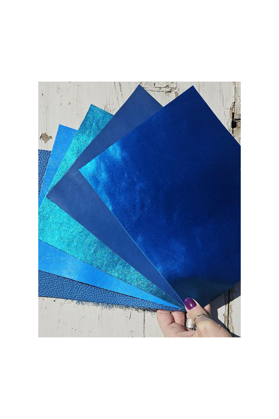5 Ritagli di pellami unici selezionati, tinta unita blu, rifinizioni e spessori diversi, pezzi come da foto 20x25 cm
