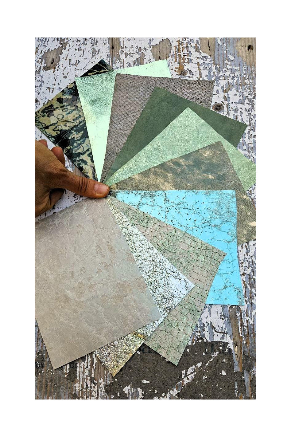 10 Ritagli di pellami unici selezionati, toni del VERDE ,stampe varie, laminate e non, pezzi mix di fantasie come da foto