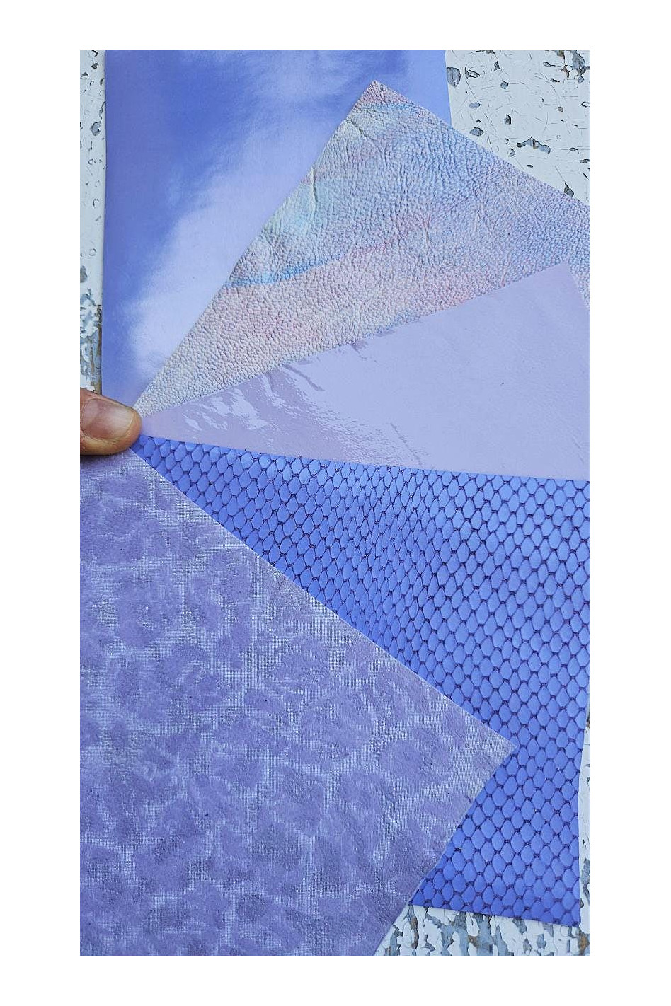 5 Ritagli di pellami unici selezionati, toni LILLA VIOLETTO, stampe varie, laminate e non, pezzi mix di fantasie come da foto