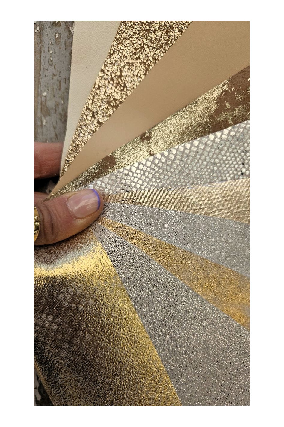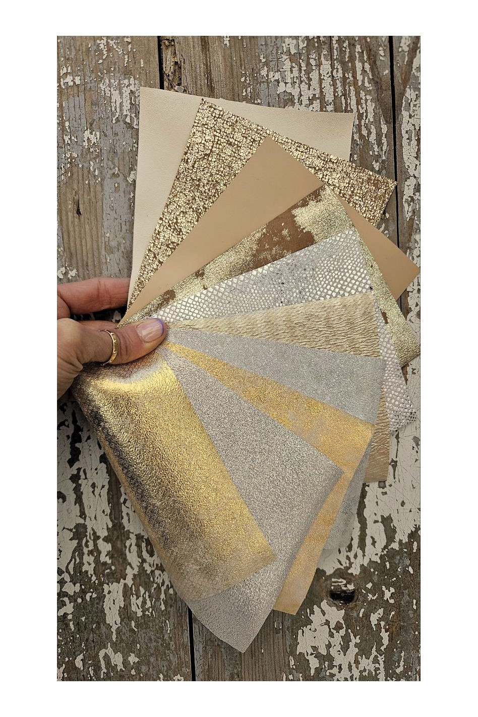 10 Ritagli di pellami unici selezionati, stampati sui toni ORO, ARGENTO e BEIGE, pezzi mix di fantasie come da foto
