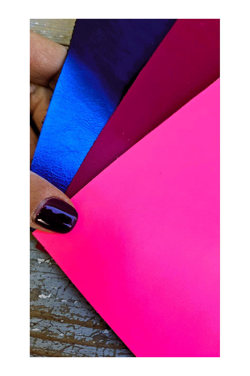 3 Ritagli di pellami unici selezionati, tinta unita, blu, rosa fluo e magenta, rifinizioni diverse pezzi come da foto 20x25 cm