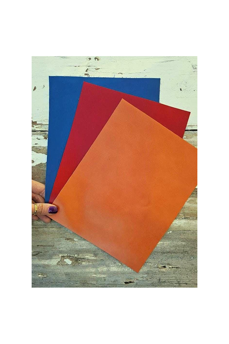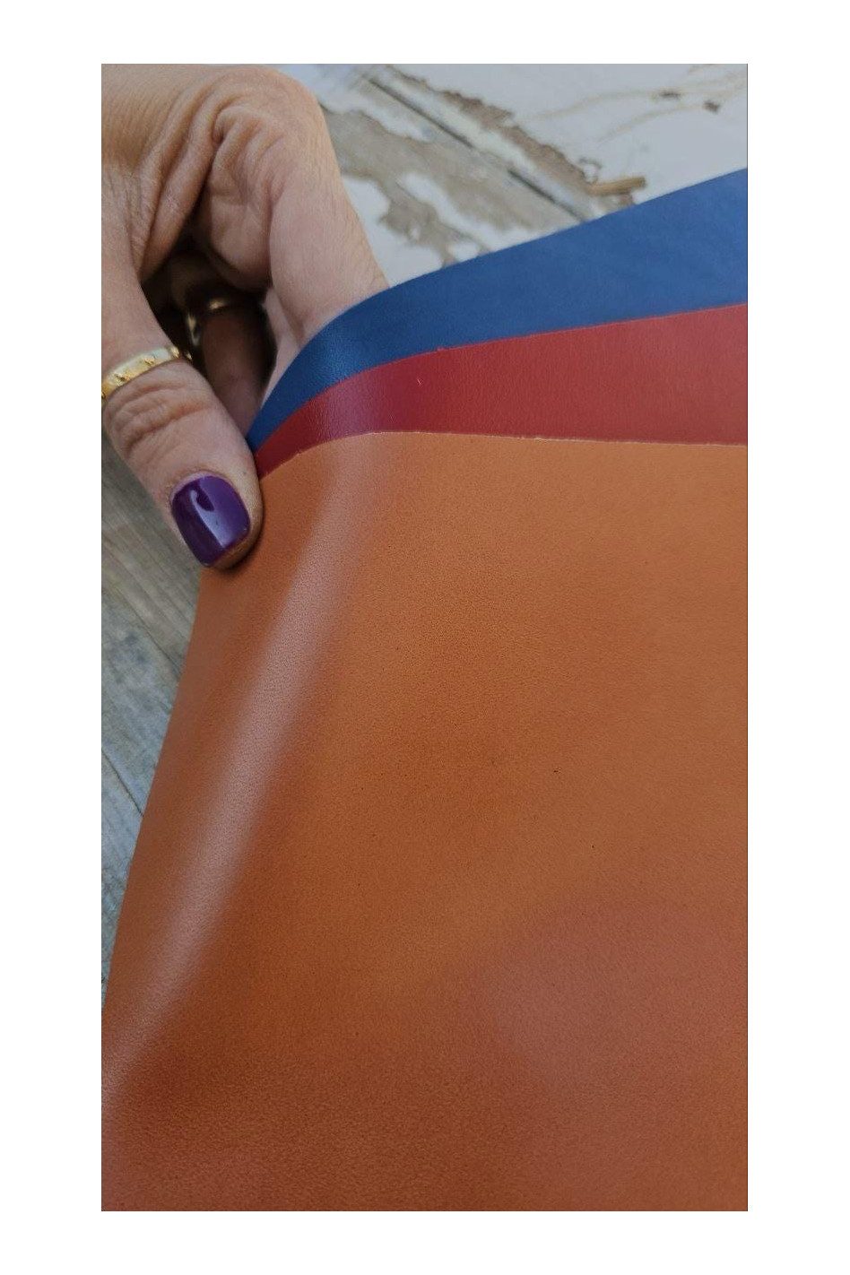 3 Scampoli grandi di Pelle di vitello - Pezzi di pellami unici selezionati scampoli blu, rosso e cuoio 25 x 20 cm