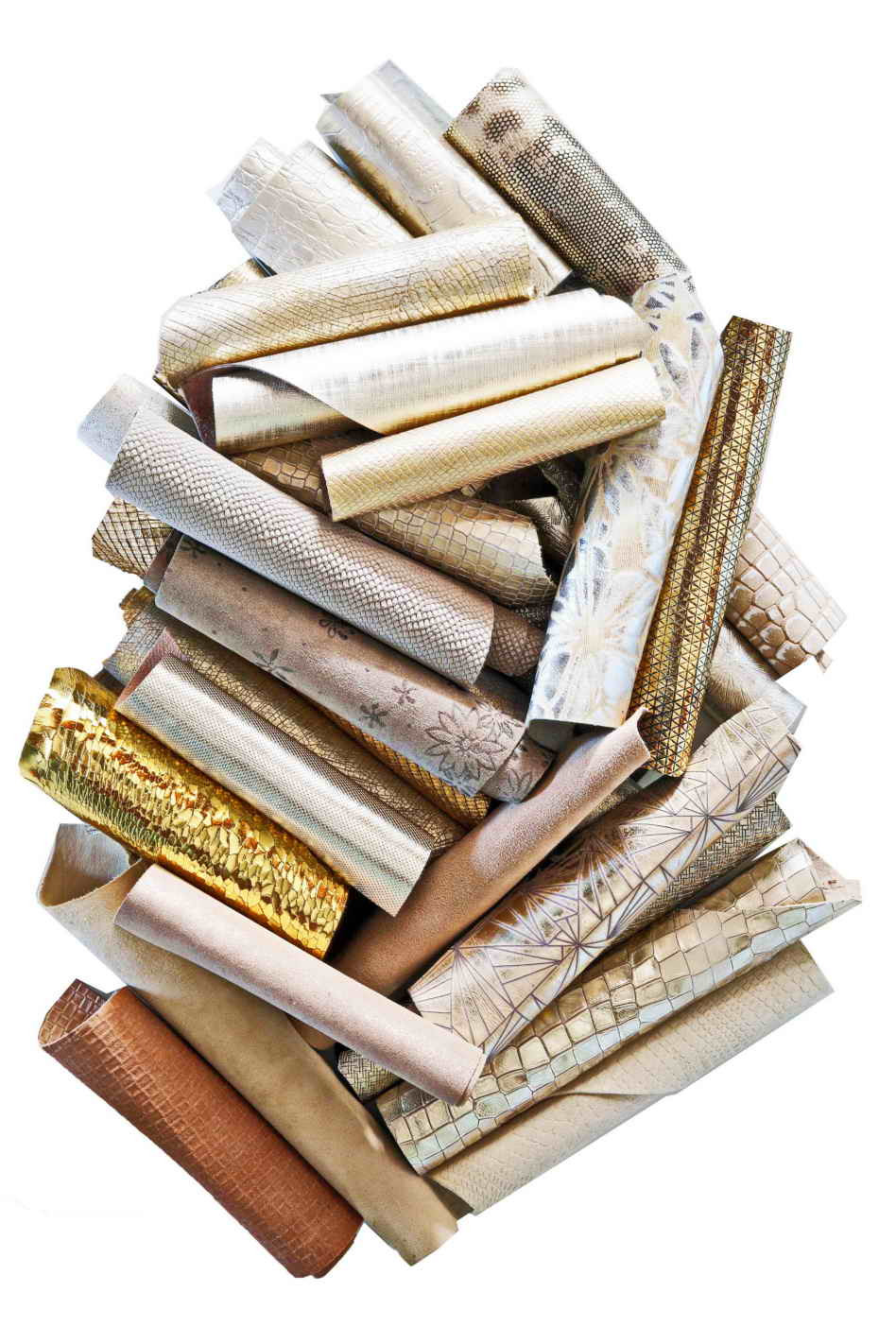 Sacchetto di ritagli di pelle miste, toni ORO,PLATINO e BEIGE, stampe, lamine, fantasie e morbidezze varie, da 0,300 a 1 kg