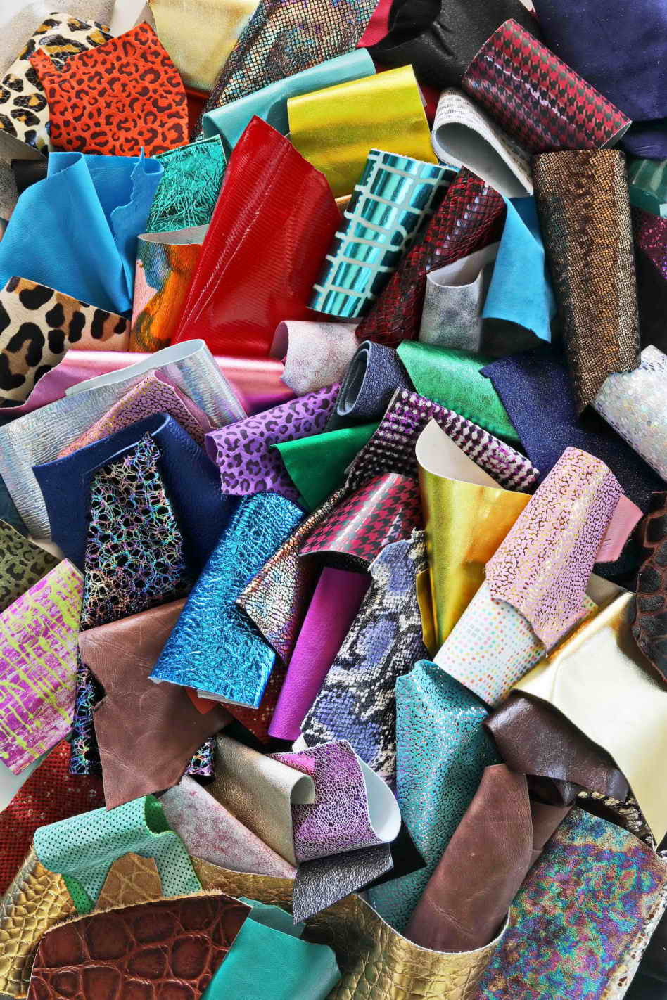 100 Ritagli di pelli, 5x10 cm misura minima, selezione CASUALE, MIX di stampe, laminate, tinta unita, vernici e vintage