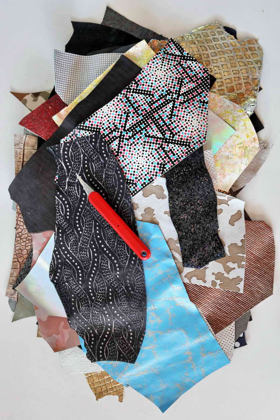 Sacchetto di ritagli di pellami di fantasia, stampati e laminati stampati.