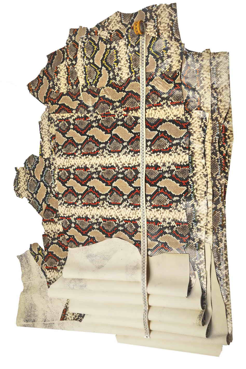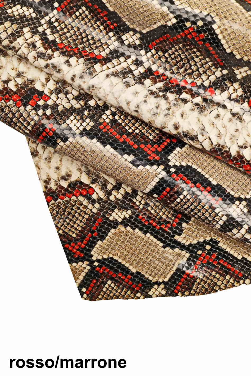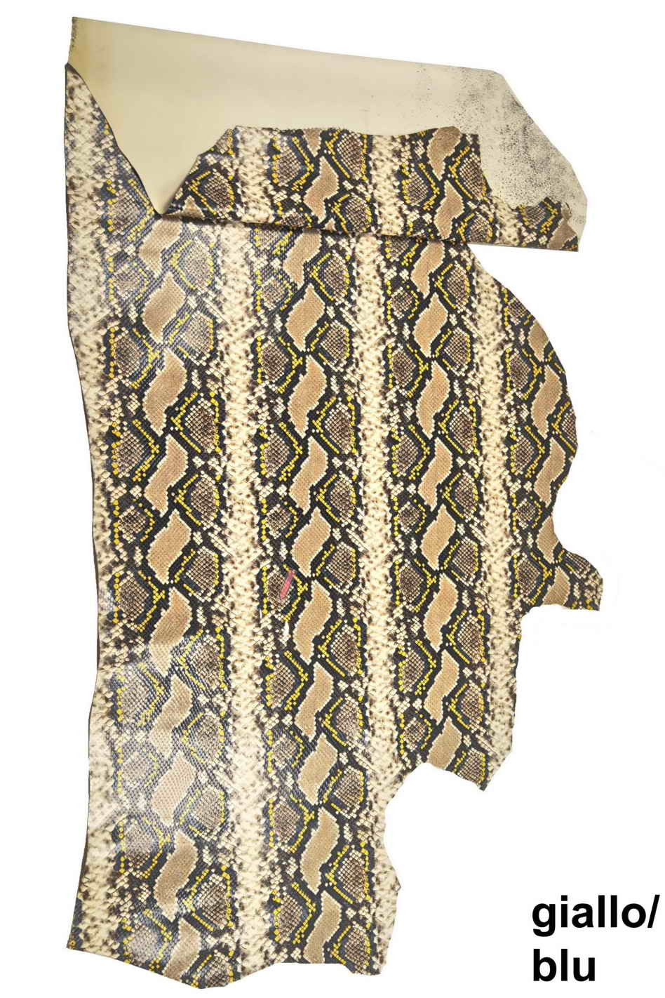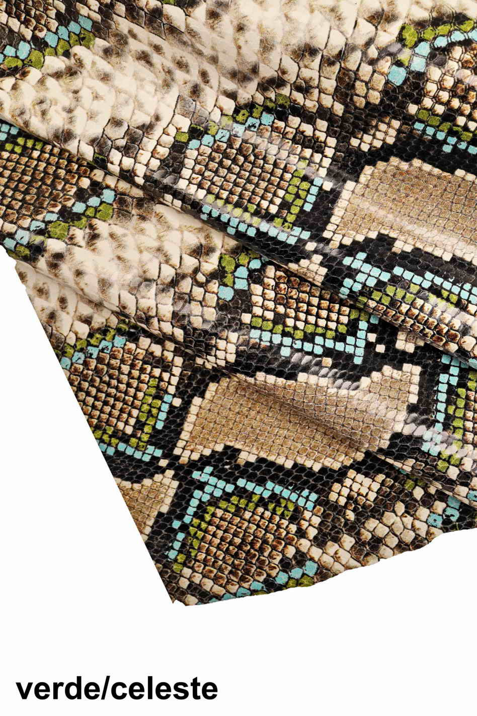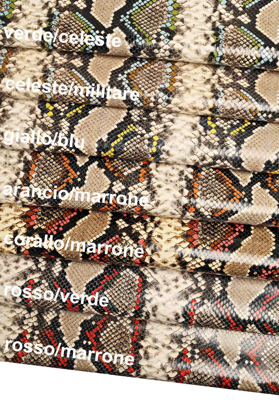 Pelle italiana, mezzo vitello stampa squametta e disegno pitone, lucido, morbido, 7 combinazioni disponibili.