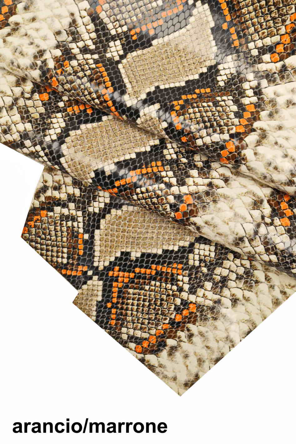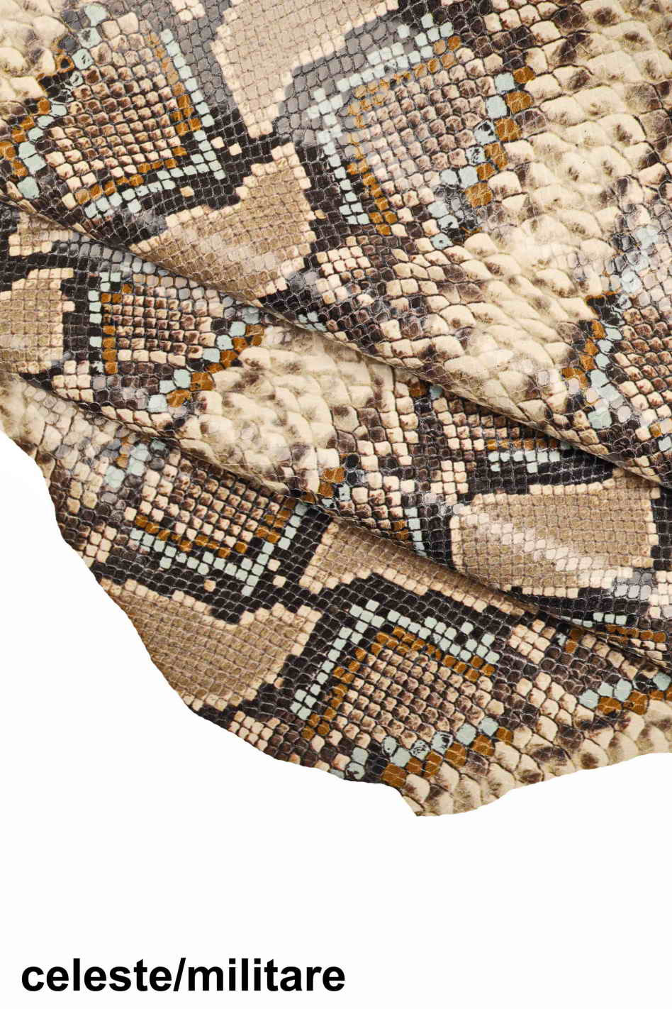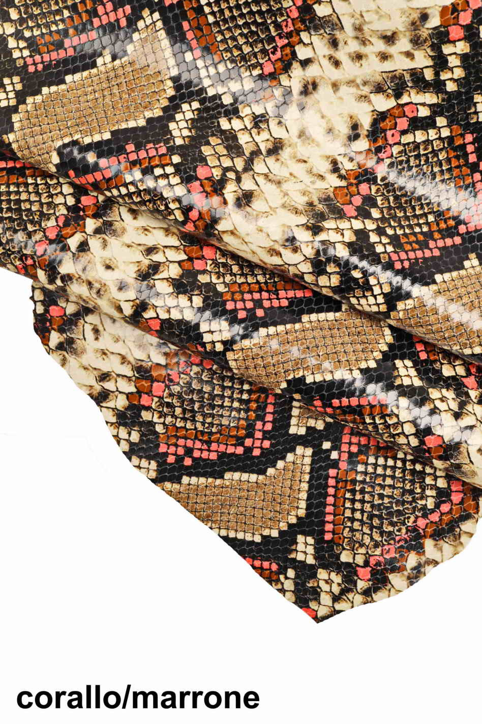 PELLE italiana, mezzo VITELLO stampa squametta e disegno pitone, lucido, morbido, 7 combinazioni disponibili