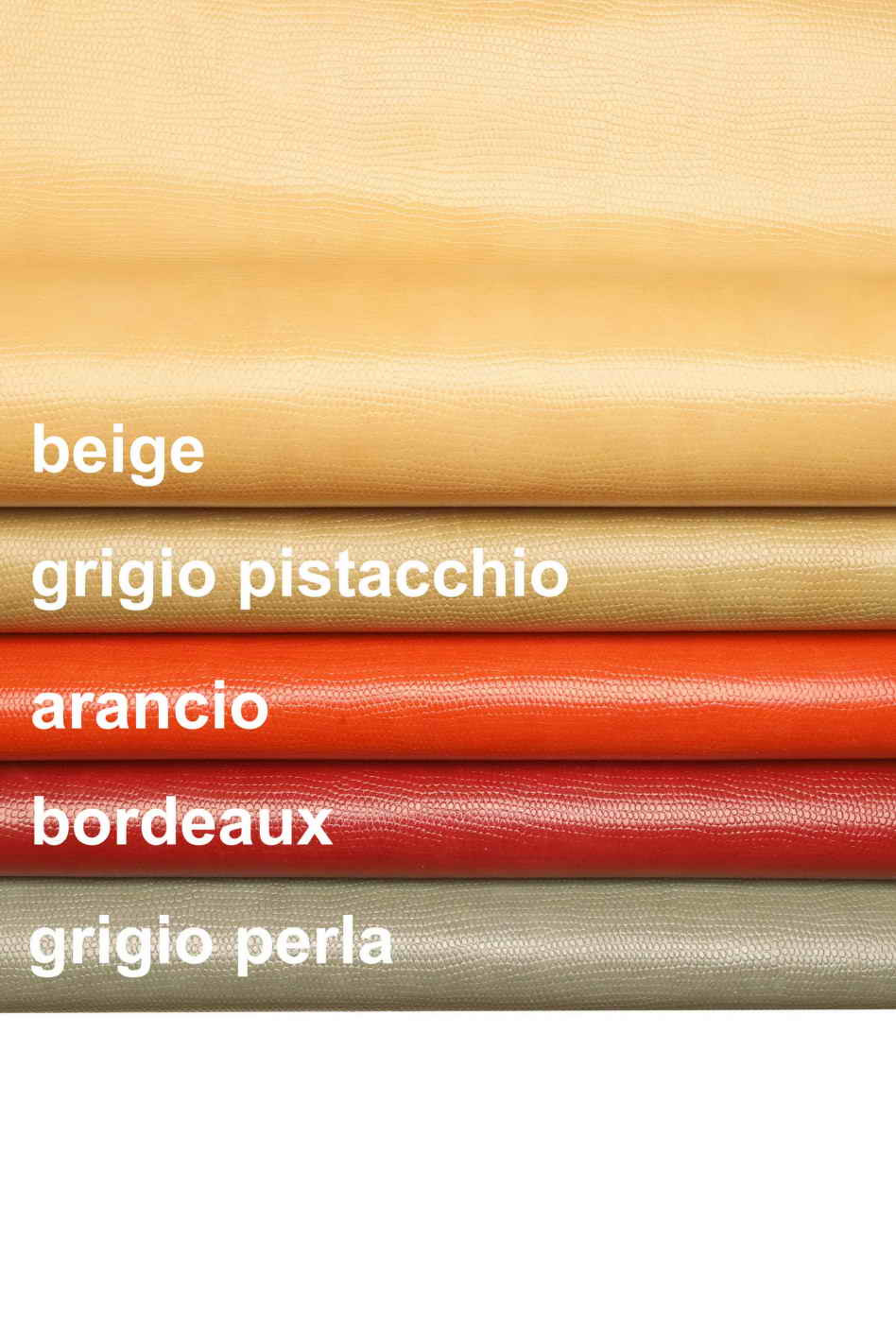 Pellame stampa lucertola, pelle di vitello stampato lizard, tejus beige, pistacchio, arancio, bordeaux, grigio perla, lucido