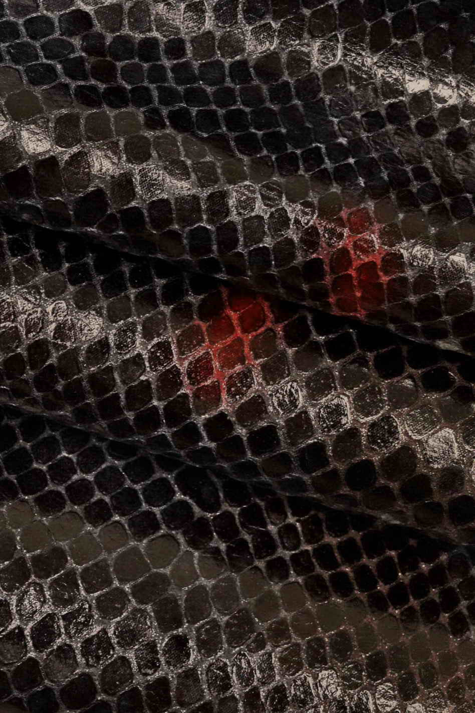 Particolare pelle di capra blu e rossa con stampa squama pitone, morbida e lucida.
