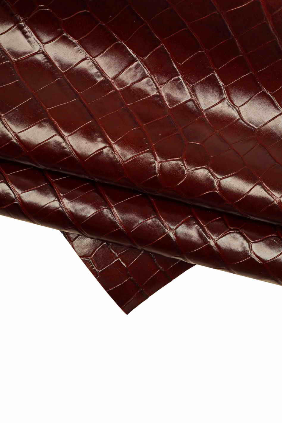 Elegante classico VITELLO stampato COCCODRILLO rosso scuro, pellame stampa cocco bordeaux, pelle lucida rigida motivo animalier. Questo materiale è perfetto per la realizzazione di scarpe, borse, cartelle, pochette, portafogli e altri oggetti.
