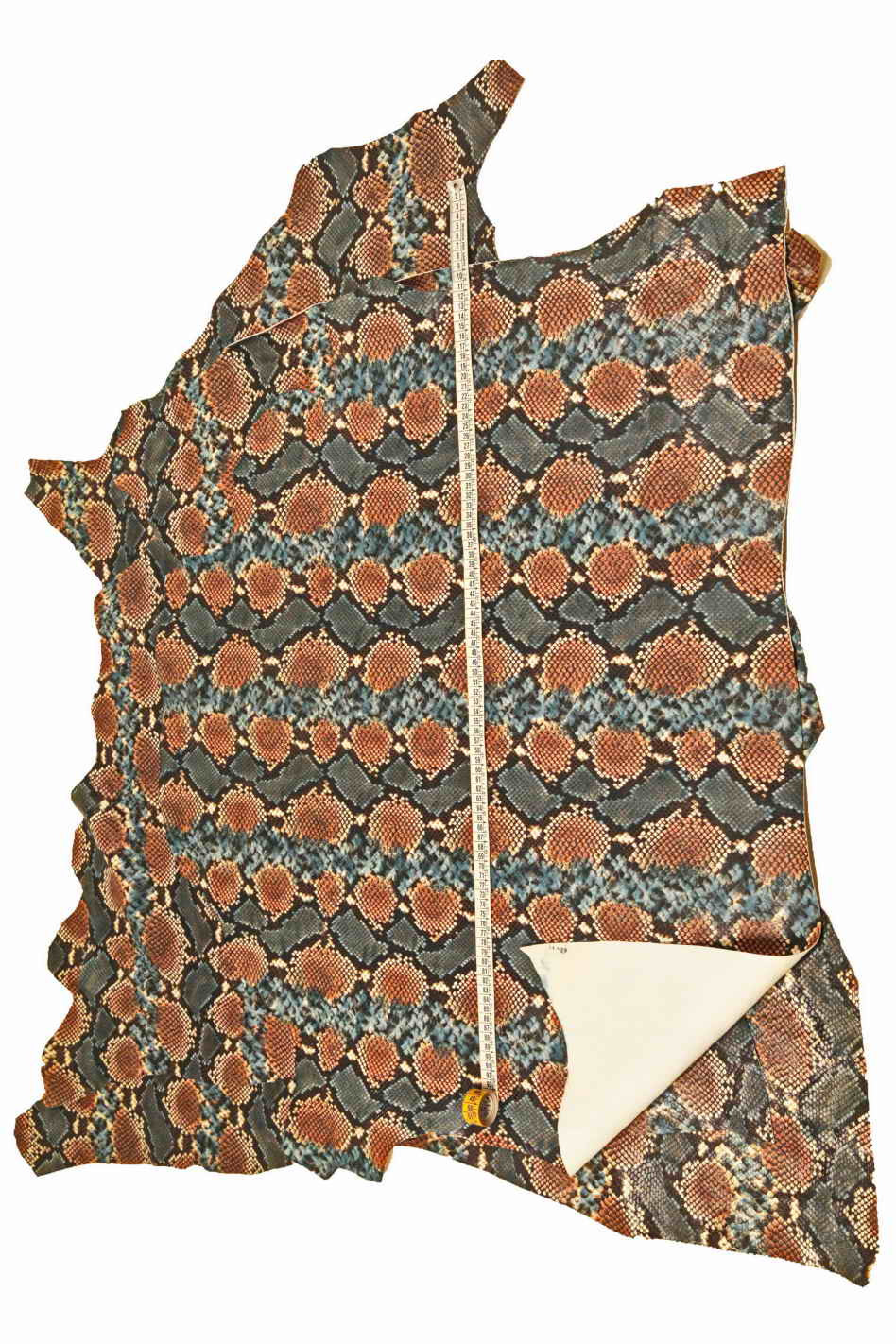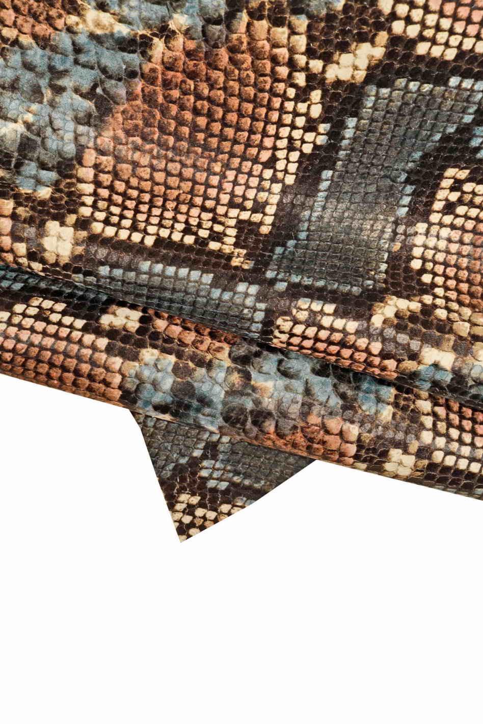 Favolosa pelle di capra stampata rettile serpente color verde, marrone e azzurro, morbida e opaca.