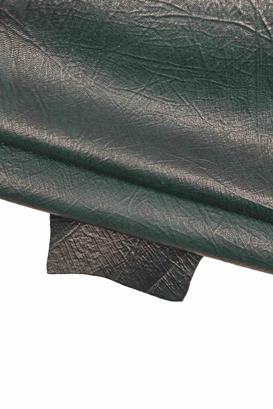 Bellissima pelle di capra vintage con stampa rugata nei colori verde scuro e rosso, sportiva e morbida.