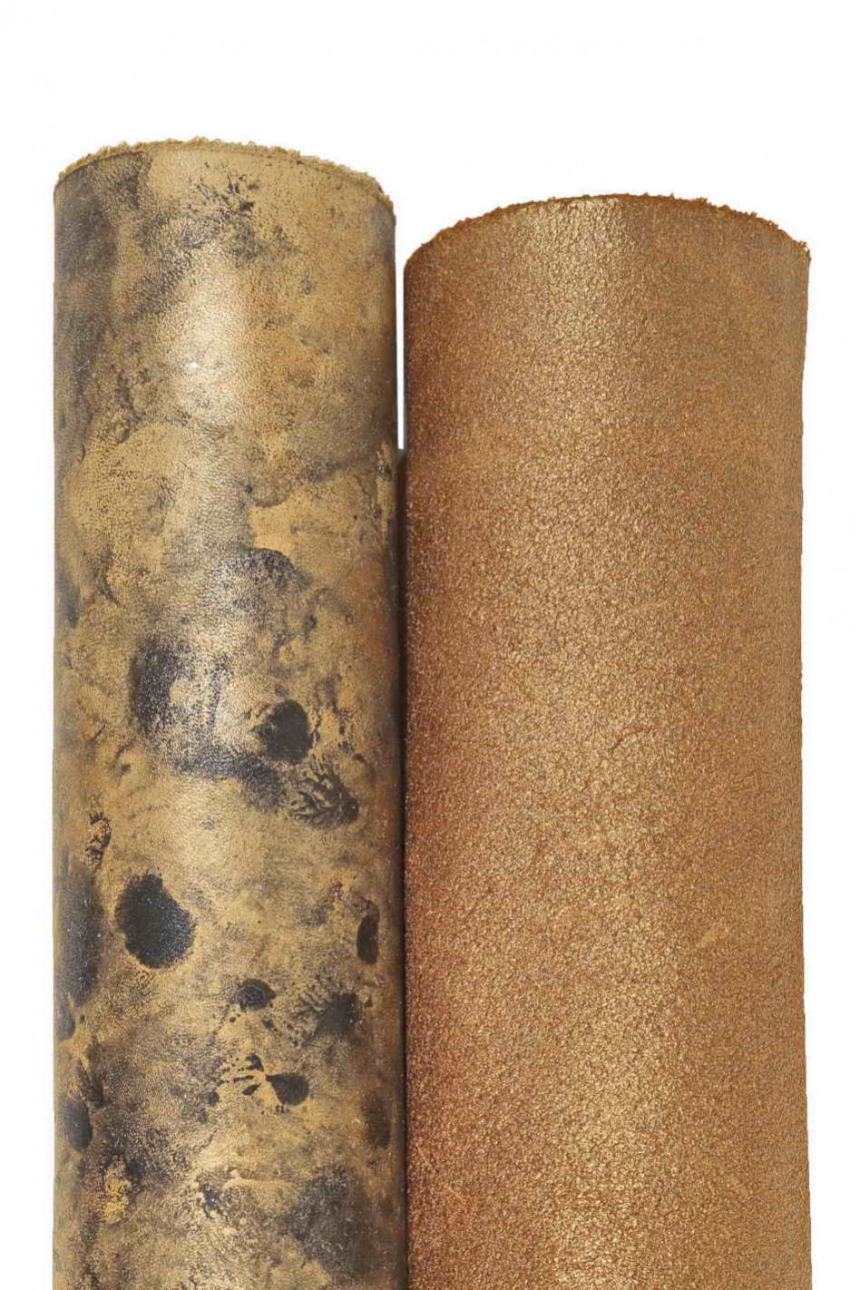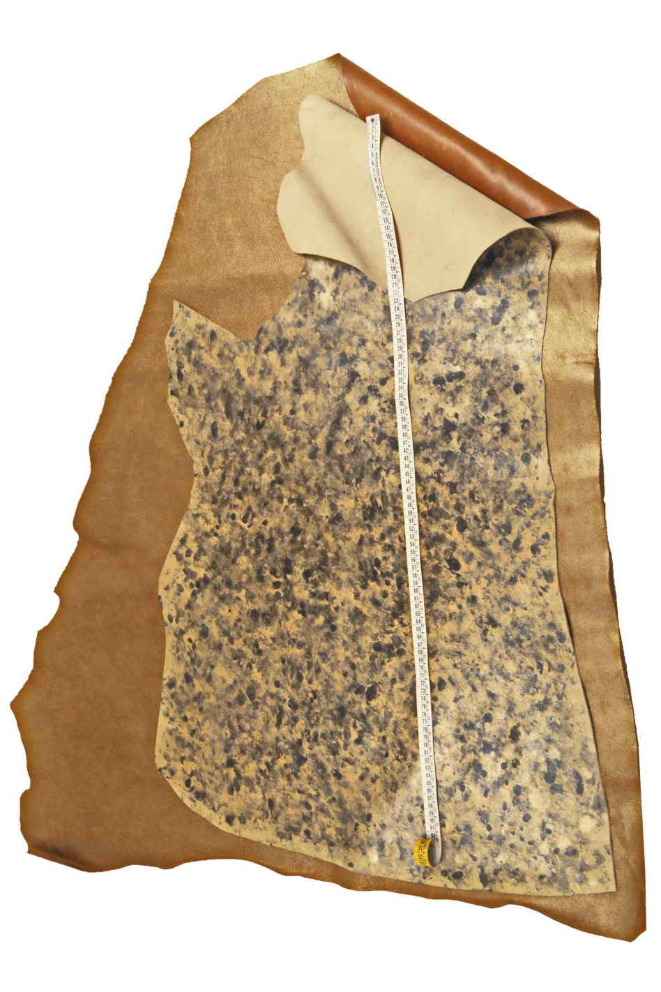 A : vitello liscio beige decorato a mano con pennellate color nero e bronzo, semi lucido, gommoso e morbido, 70x52 cm