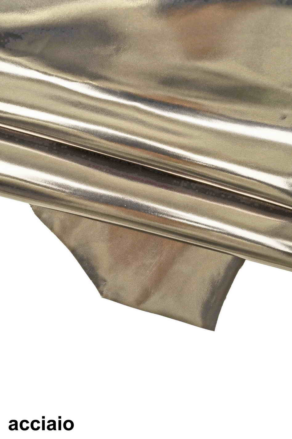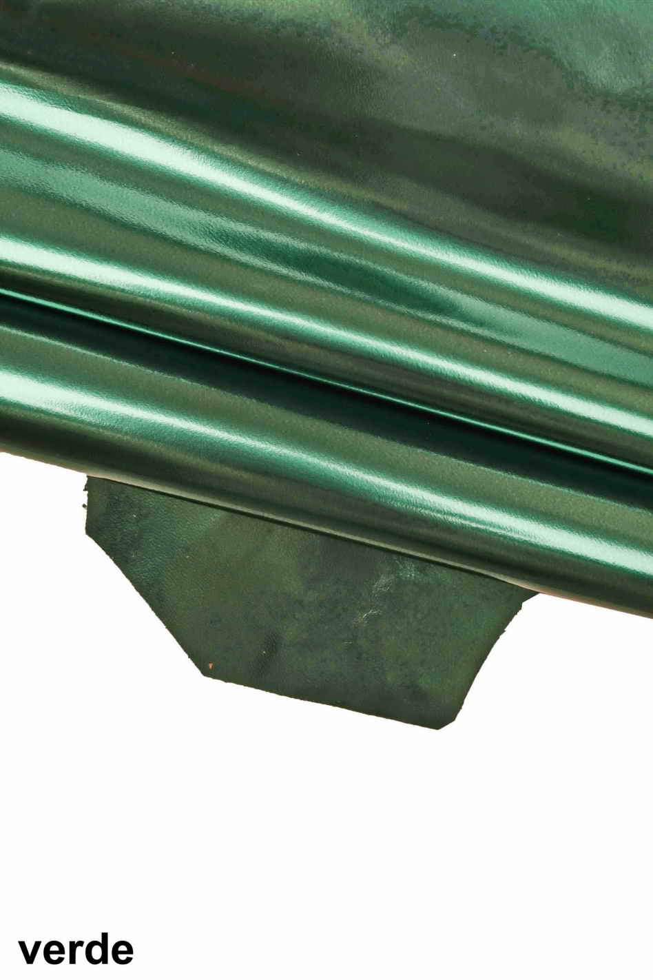 Pelle laminata SPECCHIO acciaio, verde e arancio, capra liscia metallizzata, abbastanza rigida