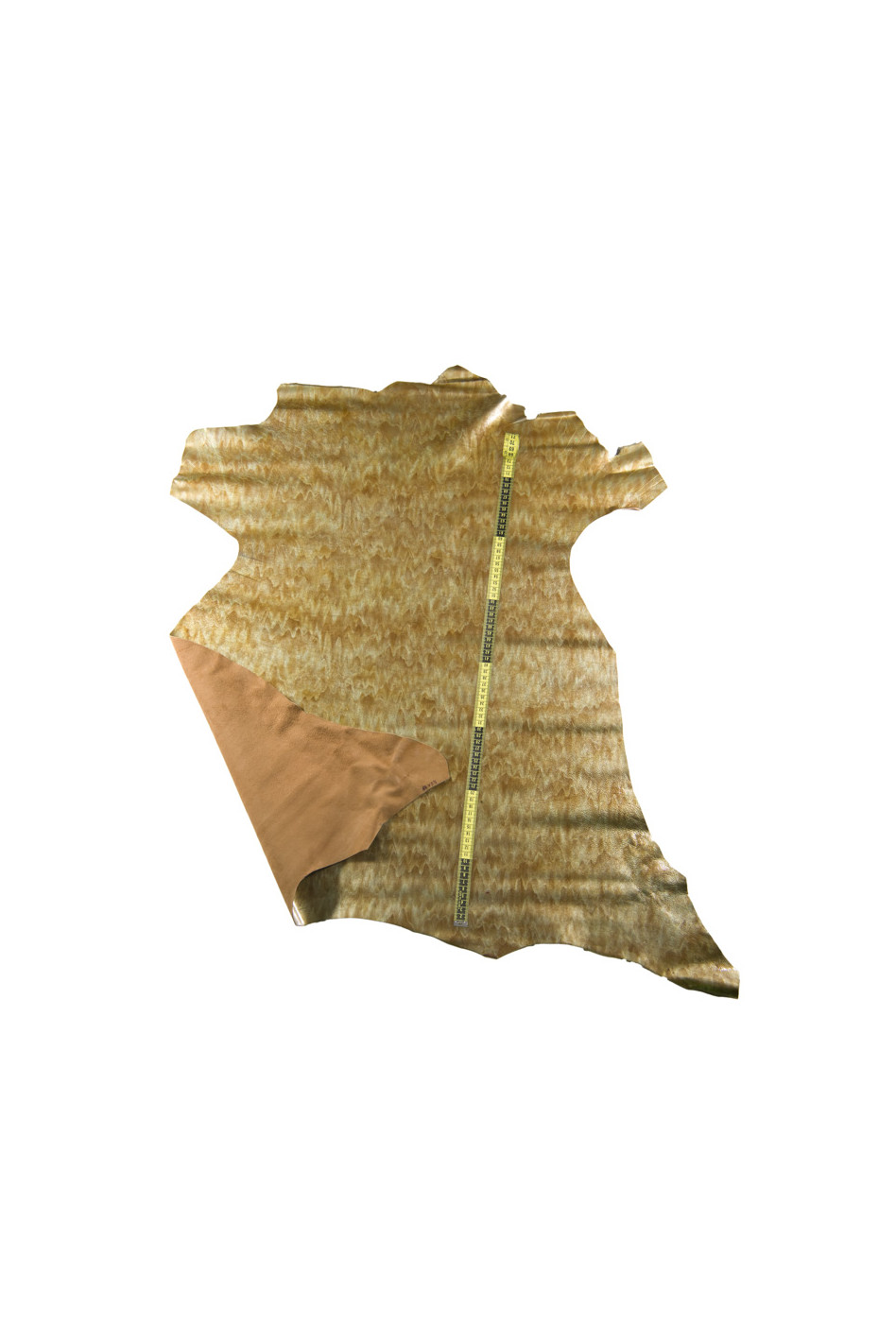Bellissima pelle oro beige lucida, capra verniciata effetto naplak, pellame dorato stropicciato stampa simil onda. Perfetta per la realizzazione di oggetti artigianali.