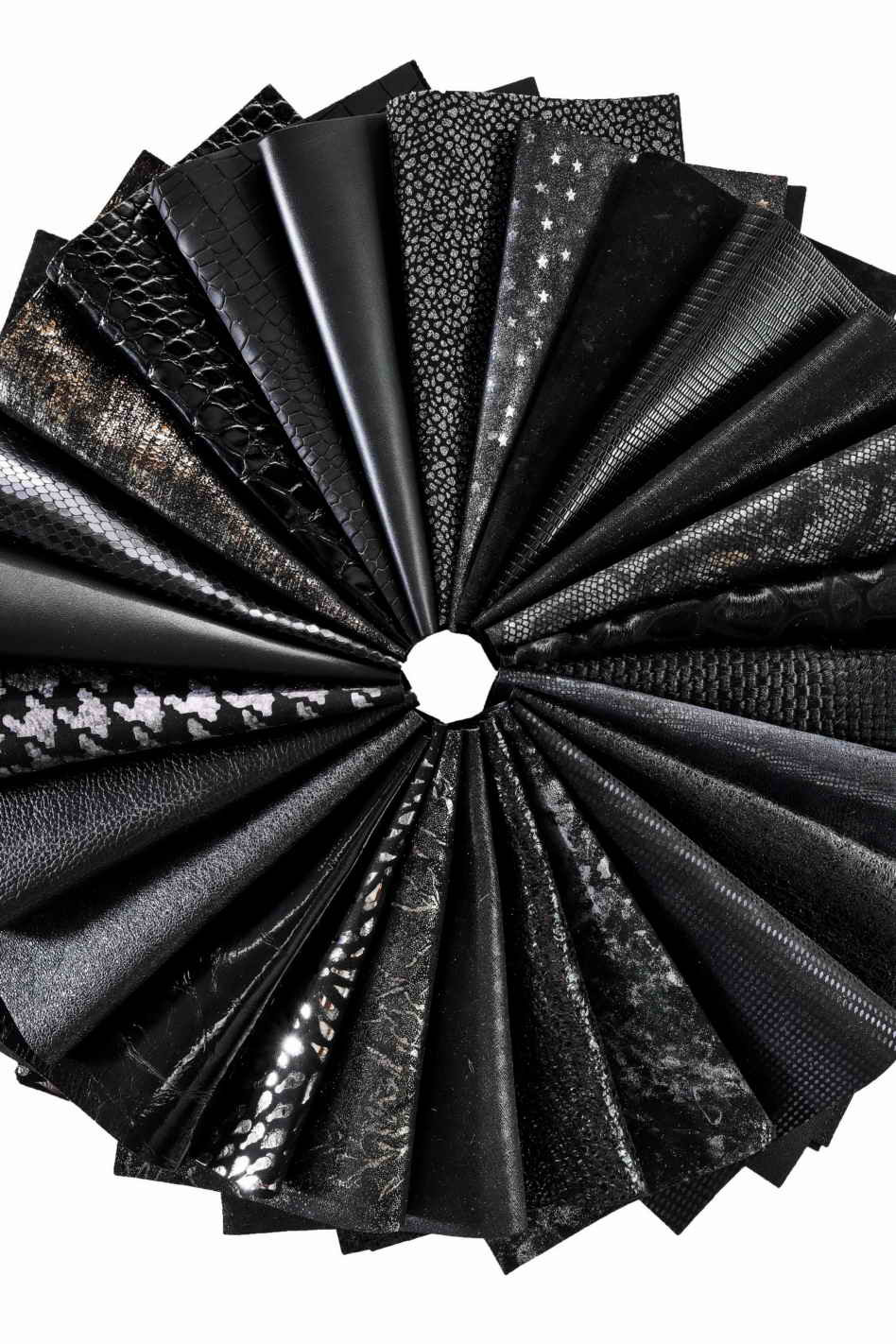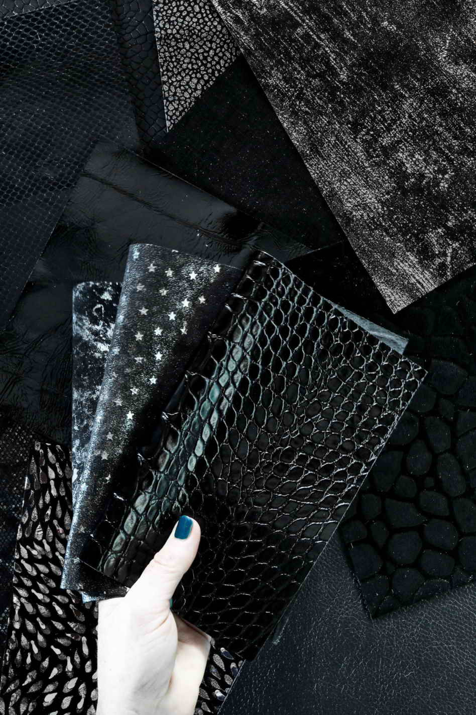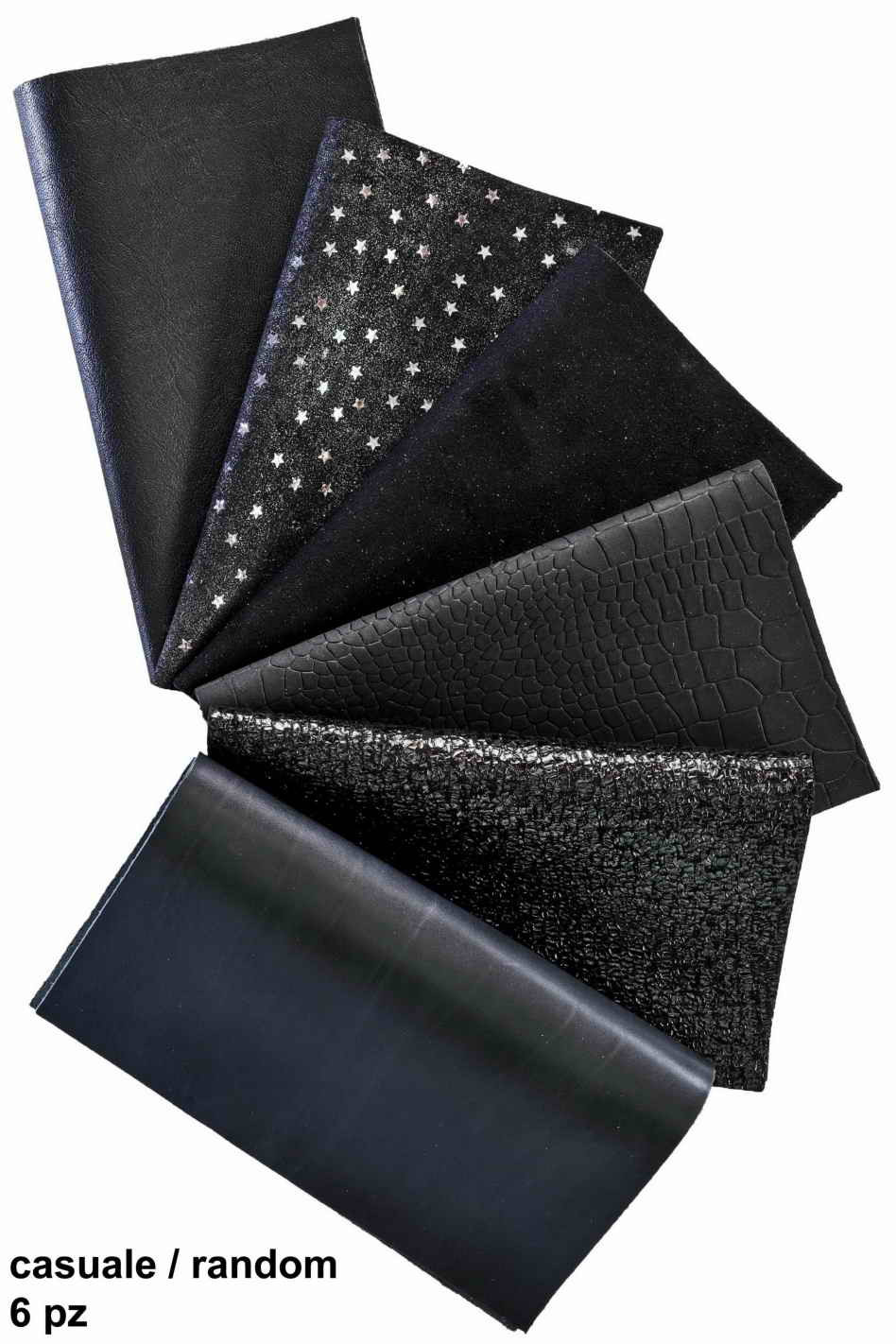 Scampoli di pellami sul tono del nero, pretagliati casuali, laminati, stampati tinta unita, misura 25 x 20 cm.
