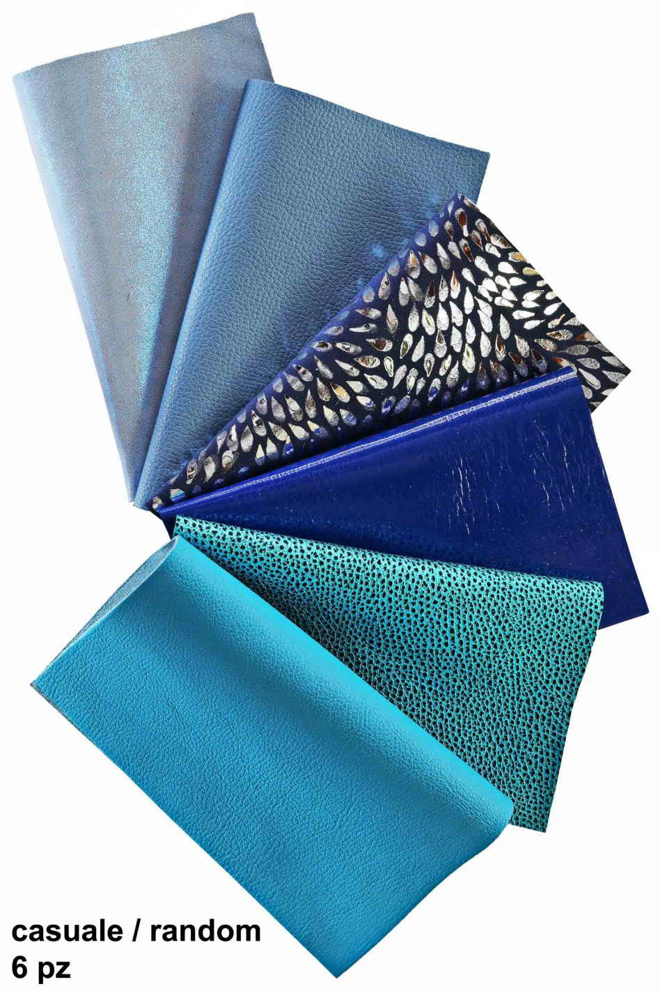 Scampoli di pellami sul tono del blu, pretagliati casuali, laminati, stampati tinta unita, misura 25 x 20 cm.