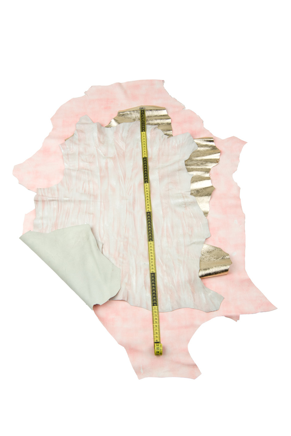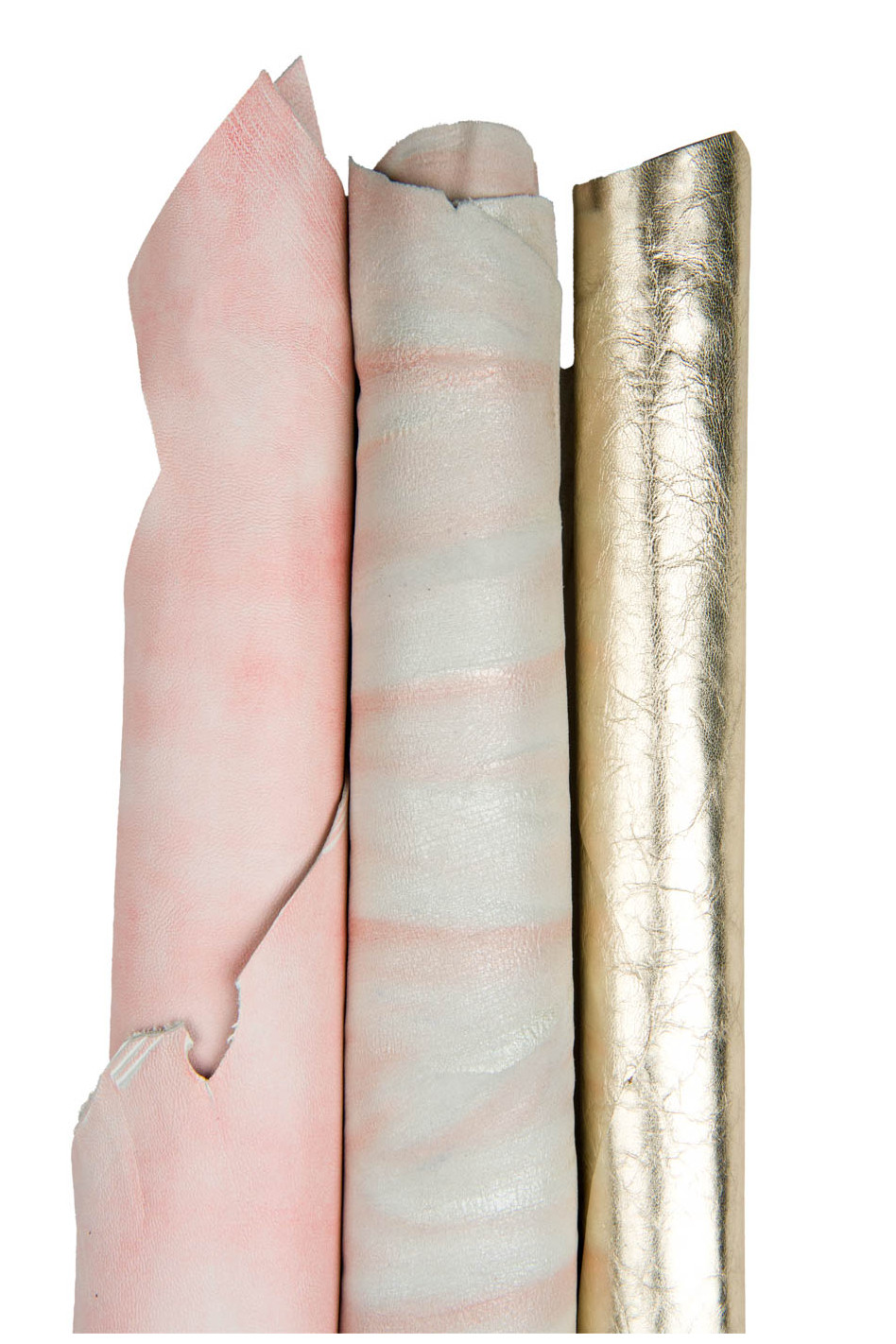 Lotto di 3 pelli ROSA e platino, assortimento pellami LAMINATI e stampati abbinati come da foto