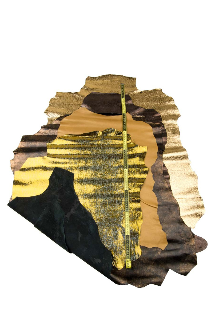 Lotto di 5 pellami oro nero, capre laminate e stampate, morbide e luminose, abbinate come da foto, qualità TOP