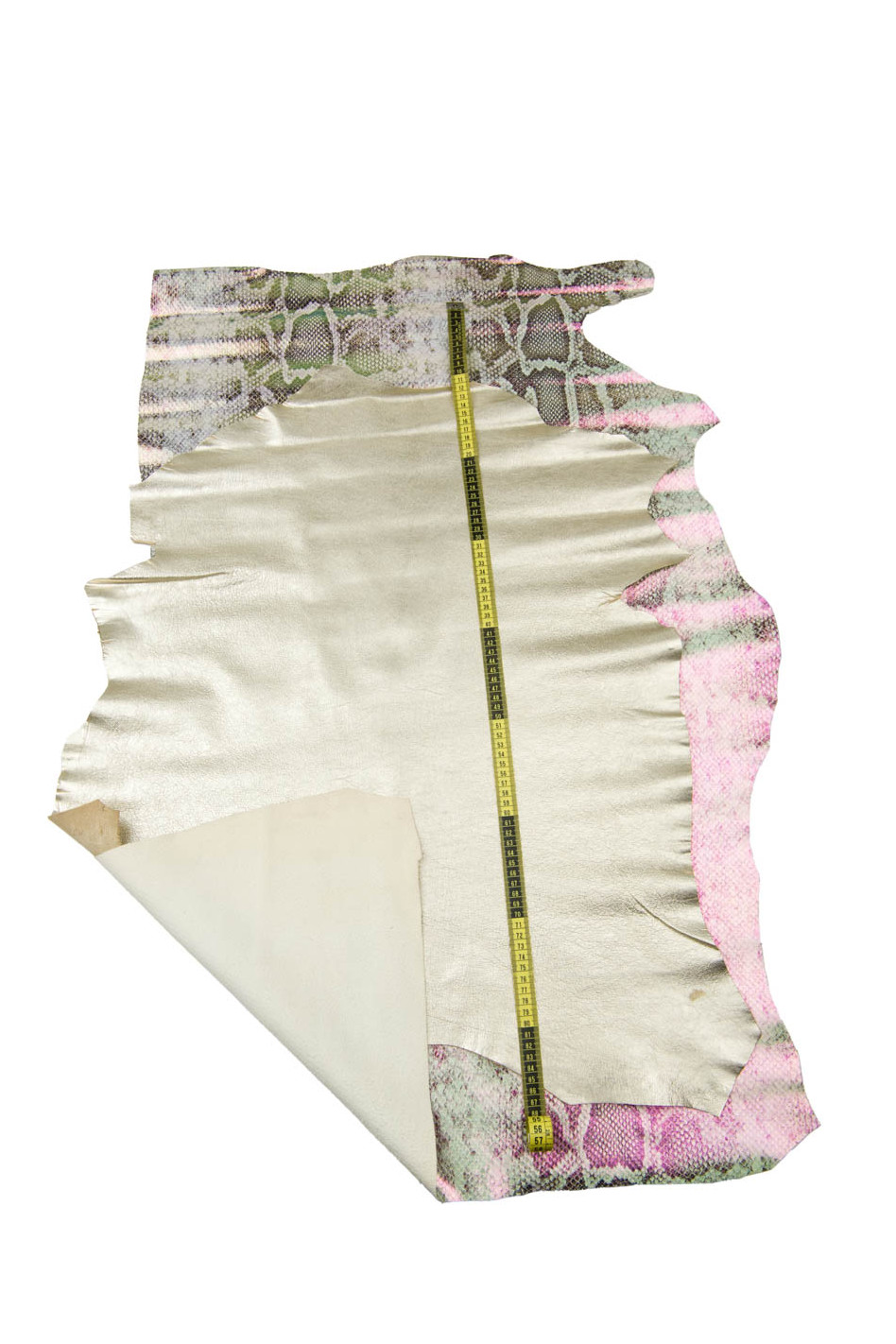 Taglia : La misura media approssimativa dal punto più corto e più stretto delle pelli è di 100 x 50 cm (pitone iridescente) e 60x47 cm (pelle platino)