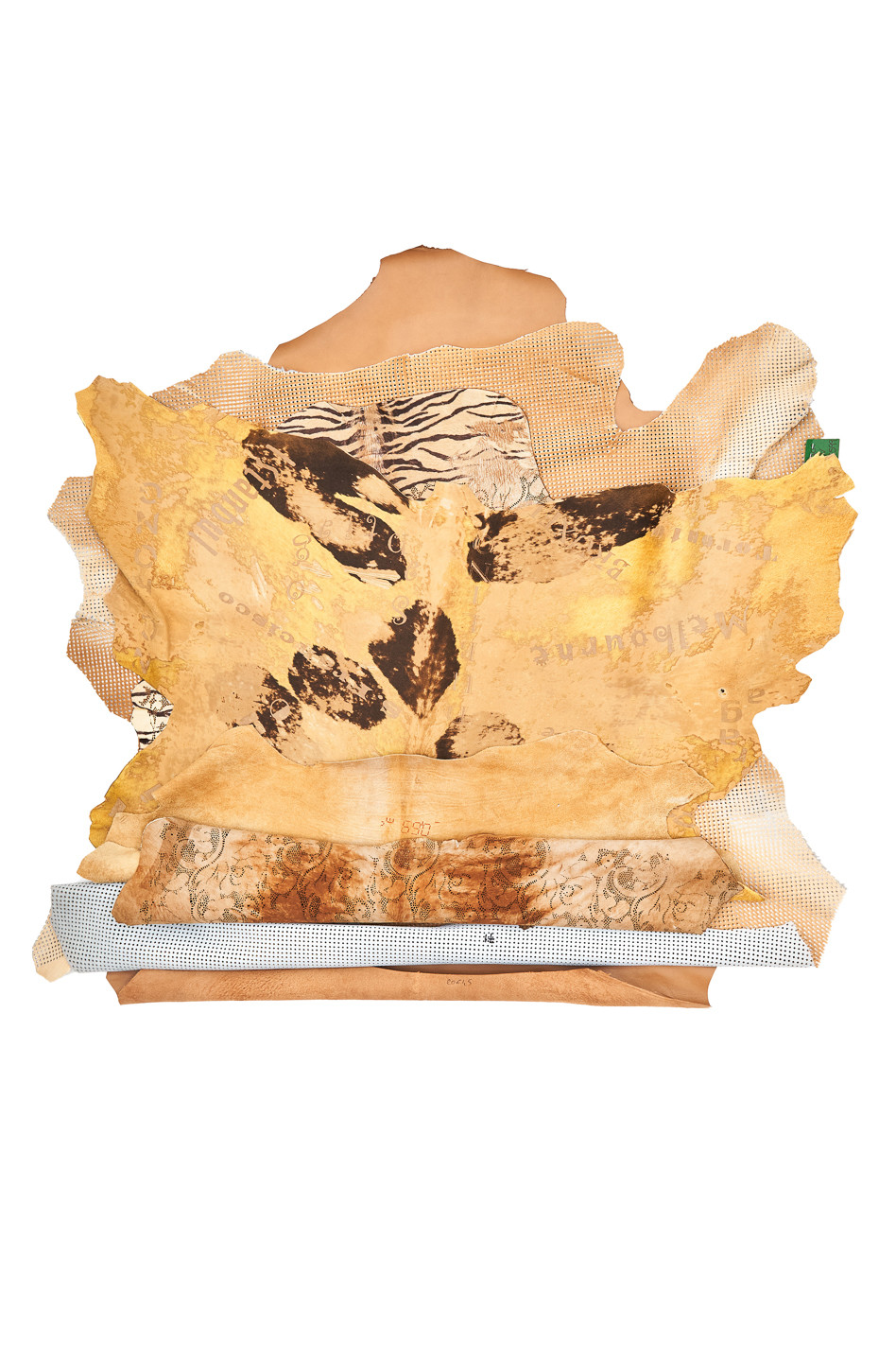 Particolare lotto di 4 pellami beige marrone abbinati, 3 pelli di cavallino stampate traforate ed 1 pelle di nappa liscia.