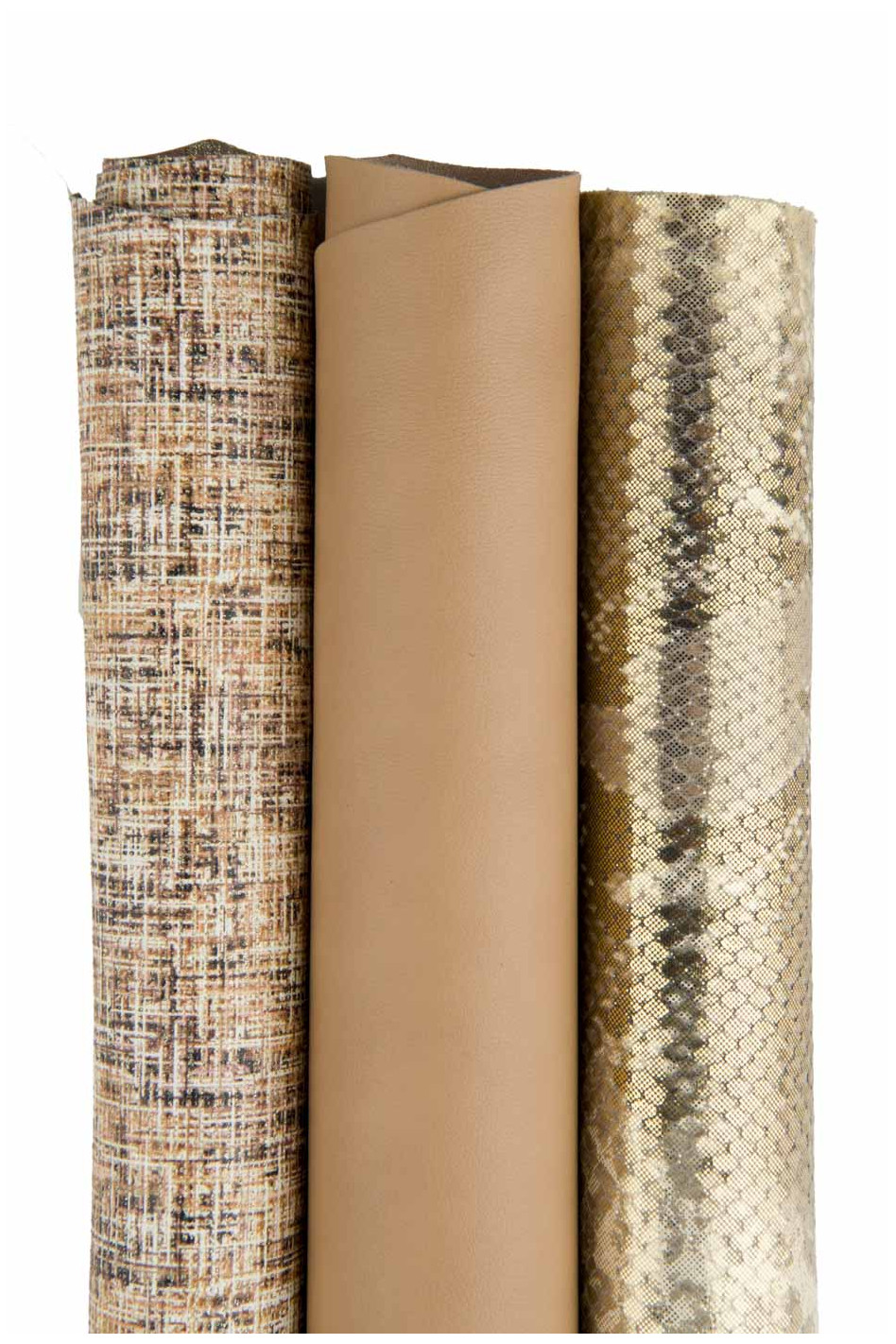 3 pelli ASSORTITE beige oro, 1 vitello liscio e 2 pelli laminate stampate come da foto
