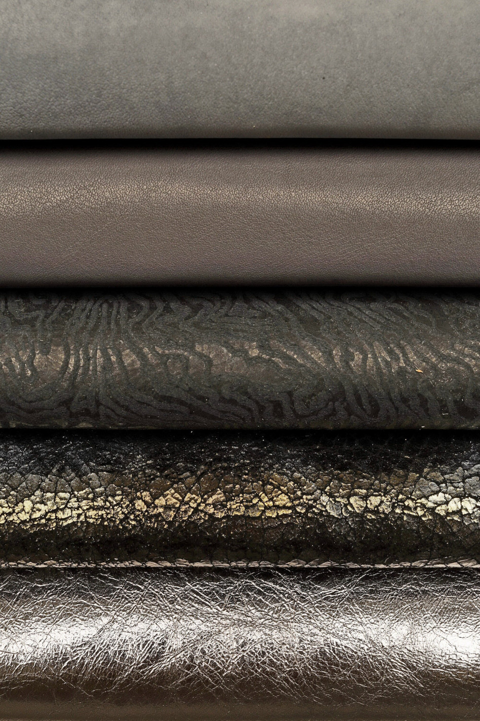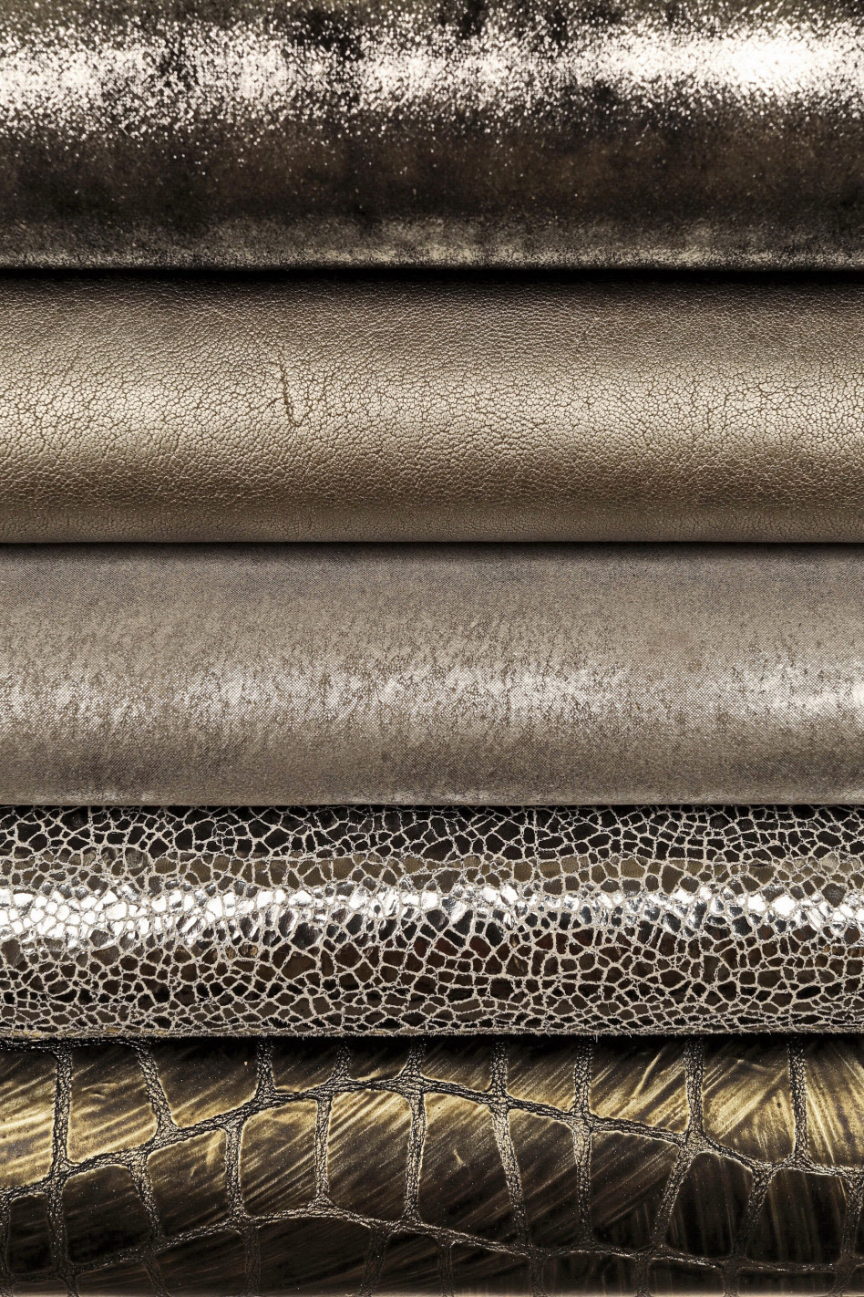 Stock di 10 pelli intere CASUALI grigio, acciaio, fucile, lotto di pellami lisci, laminati, stampati in abbinamento. Materiali ideali per la creazione di borse, pochette, portafogli, orecchini, collane.