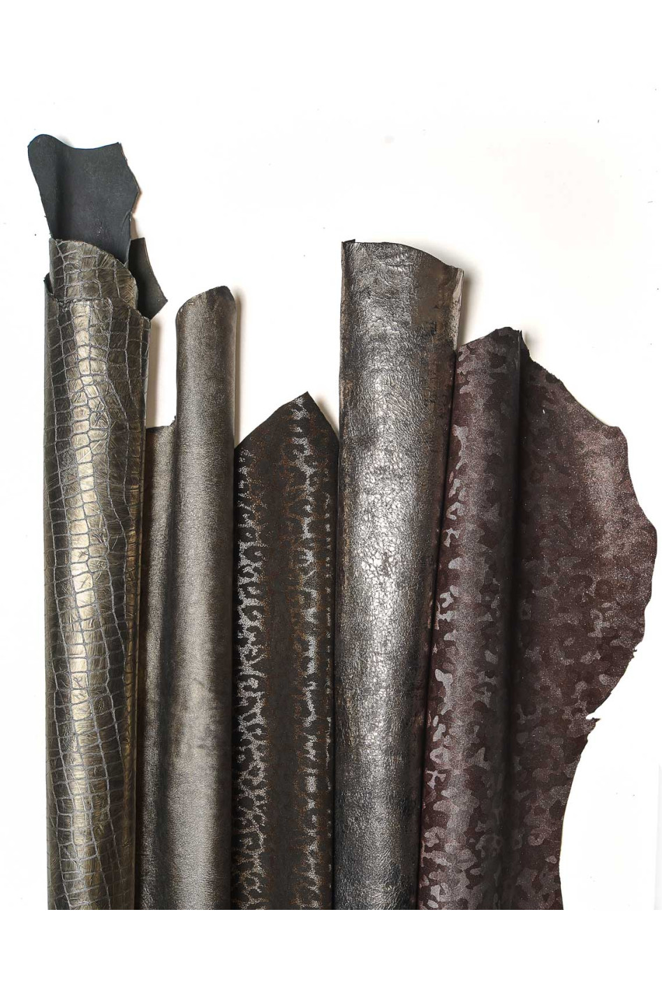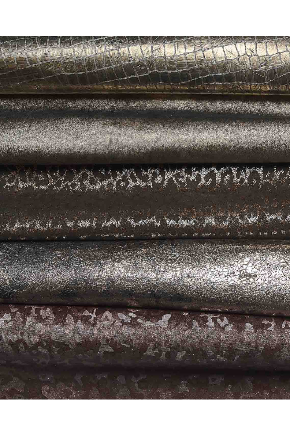 Lotto di 5 pelli acciaio, bronzo e bordeaux, assortimento CASUALE, pellami laminati stampe cocco, leopardo, camouflage