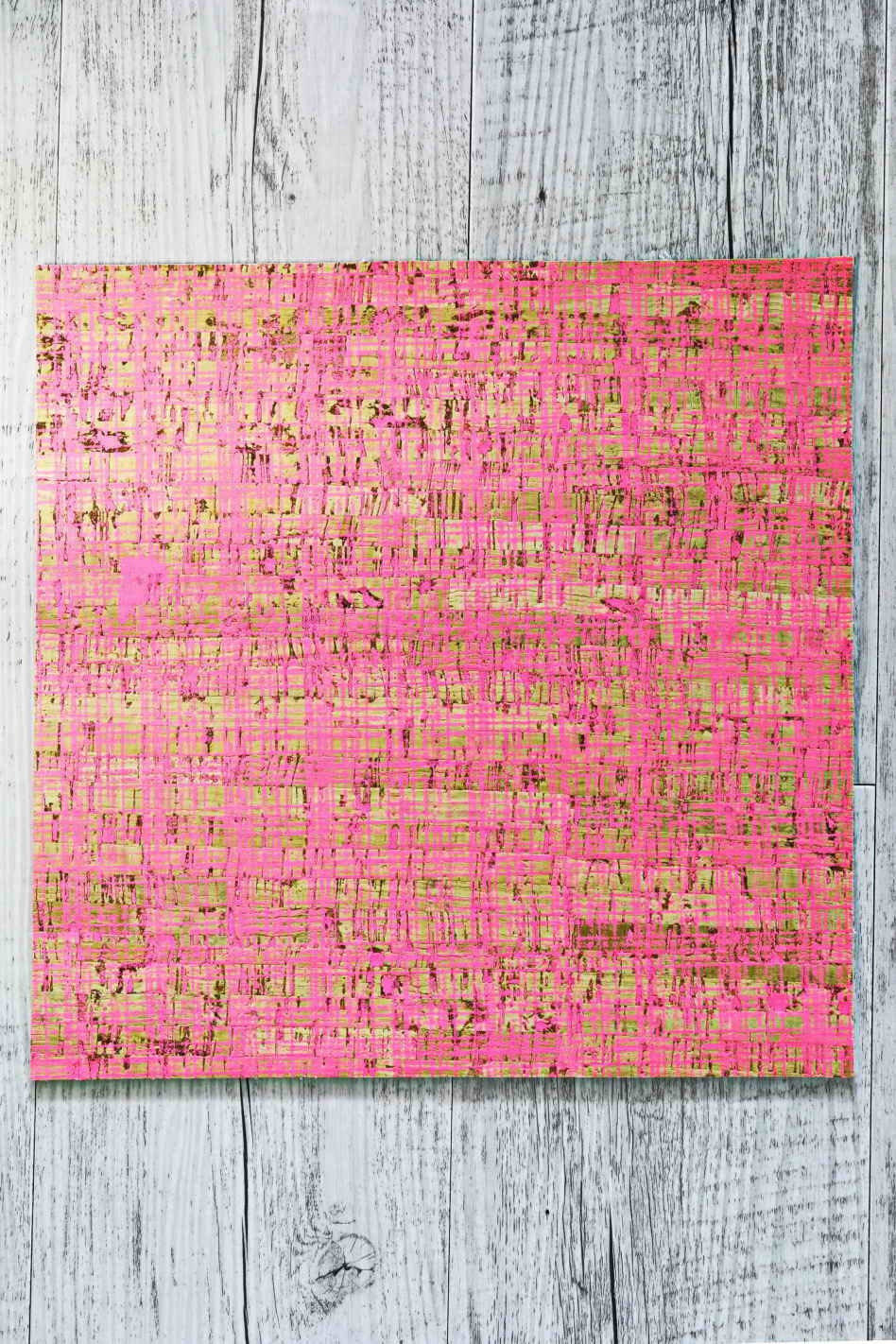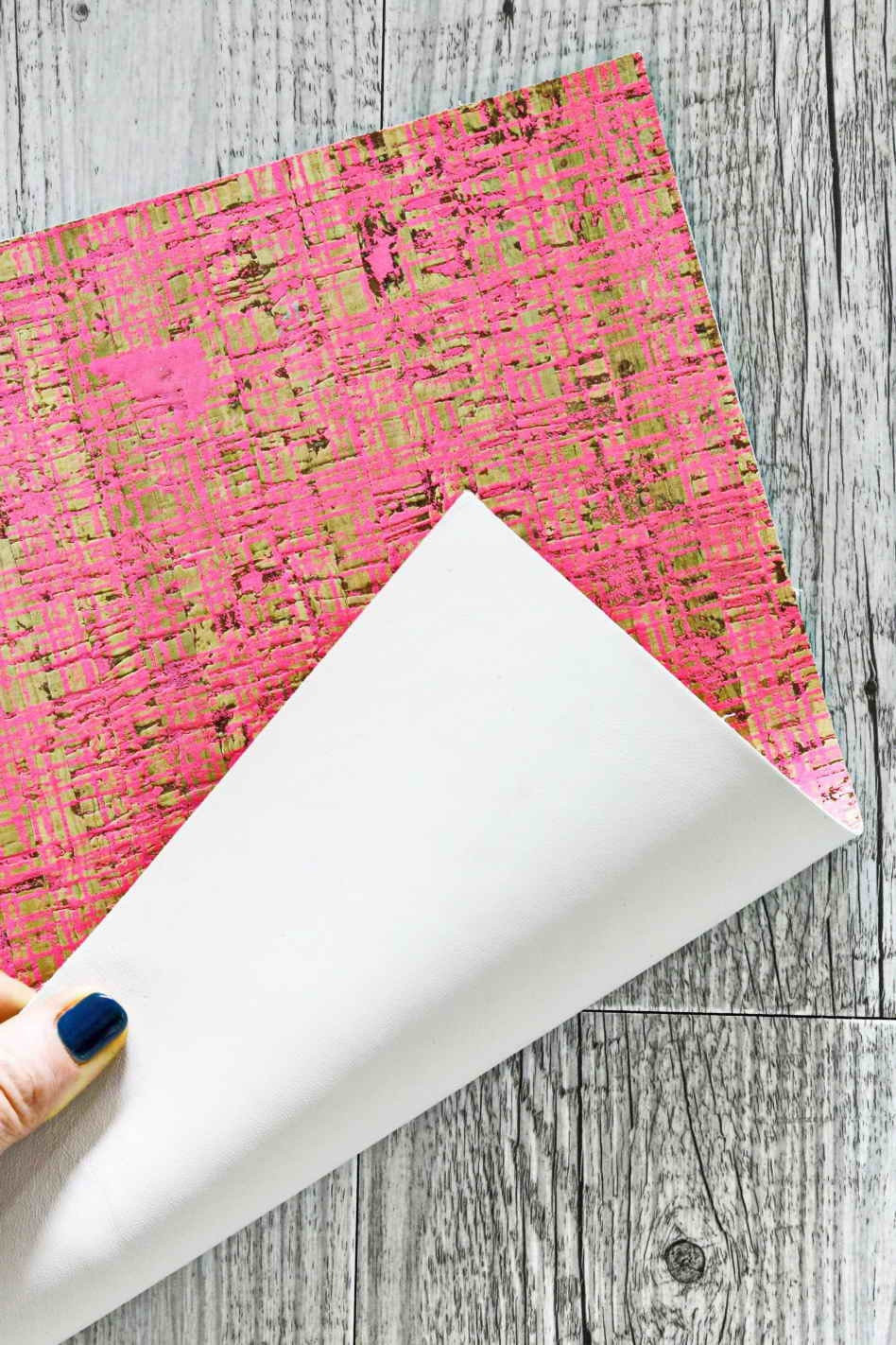 Fogli di sughero naturale stampa a quadri di color rosa di diverse misure e pelle di vitello color panna accoppiata nel retro.
