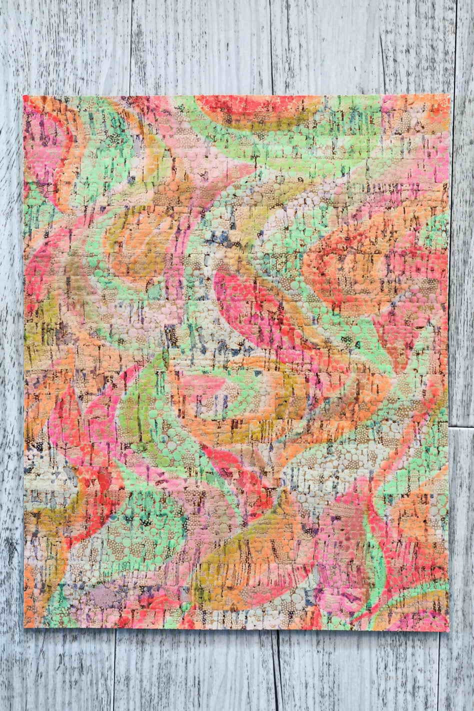 Fogli di sughero naturale con stampa astratta lucida multicolor nei toni pastello e PELLE color taupe accoppiata nel retro.